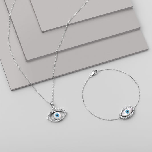 Solid Gold 0.2ct Natural Diamond Evil Eye Necklace Earrings Set