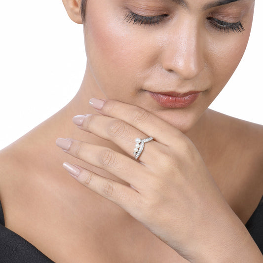 Solid Gold 1.3ct Natural Diamond w/ Pearls Cuved V Ring
