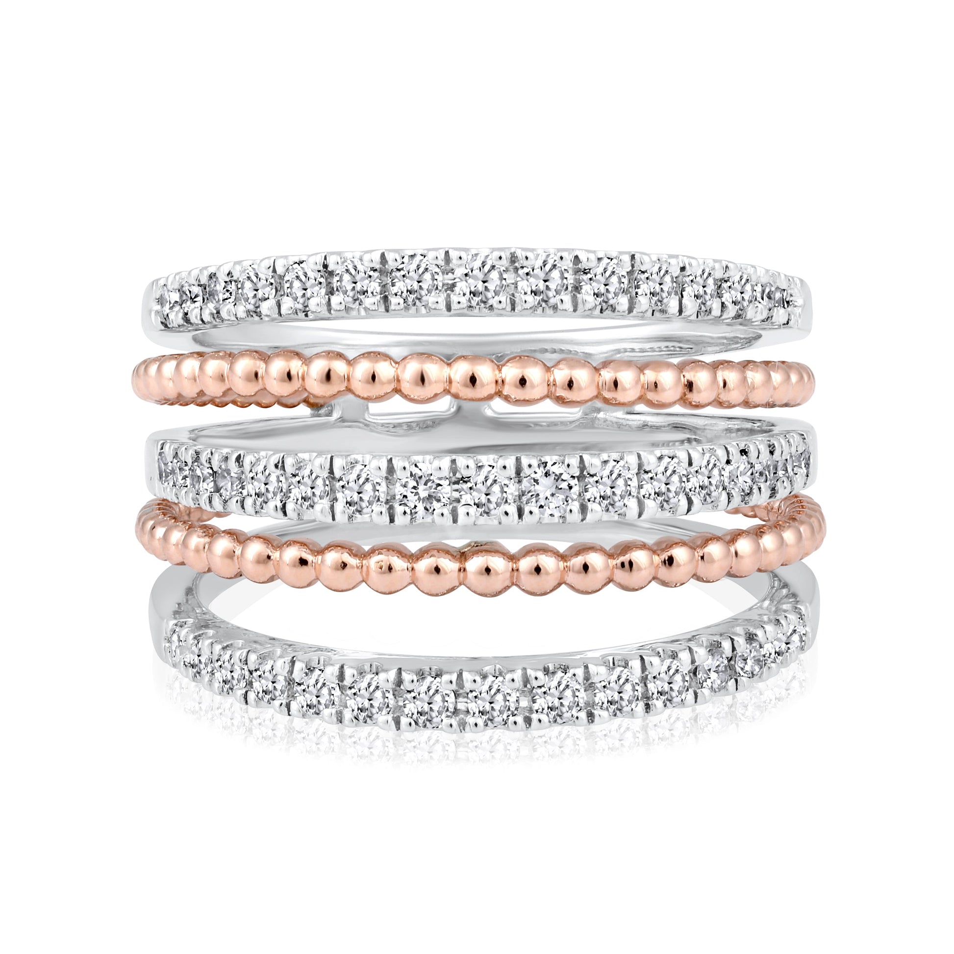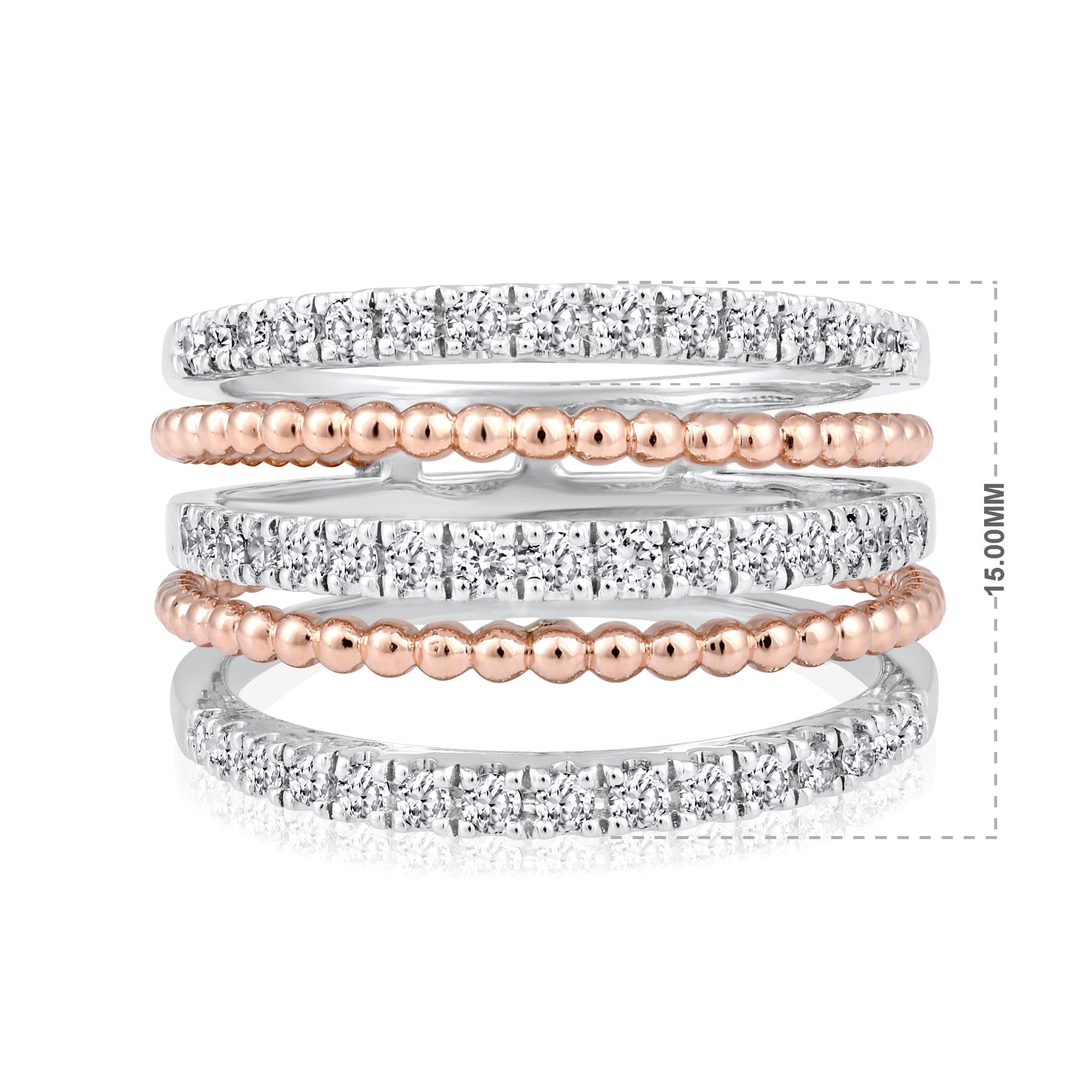 Crafted in 7.08 grams of White Gold and Rose Gold, the ring features 47 stones of Natural Diamonds with a total weight of 0.69 carats.